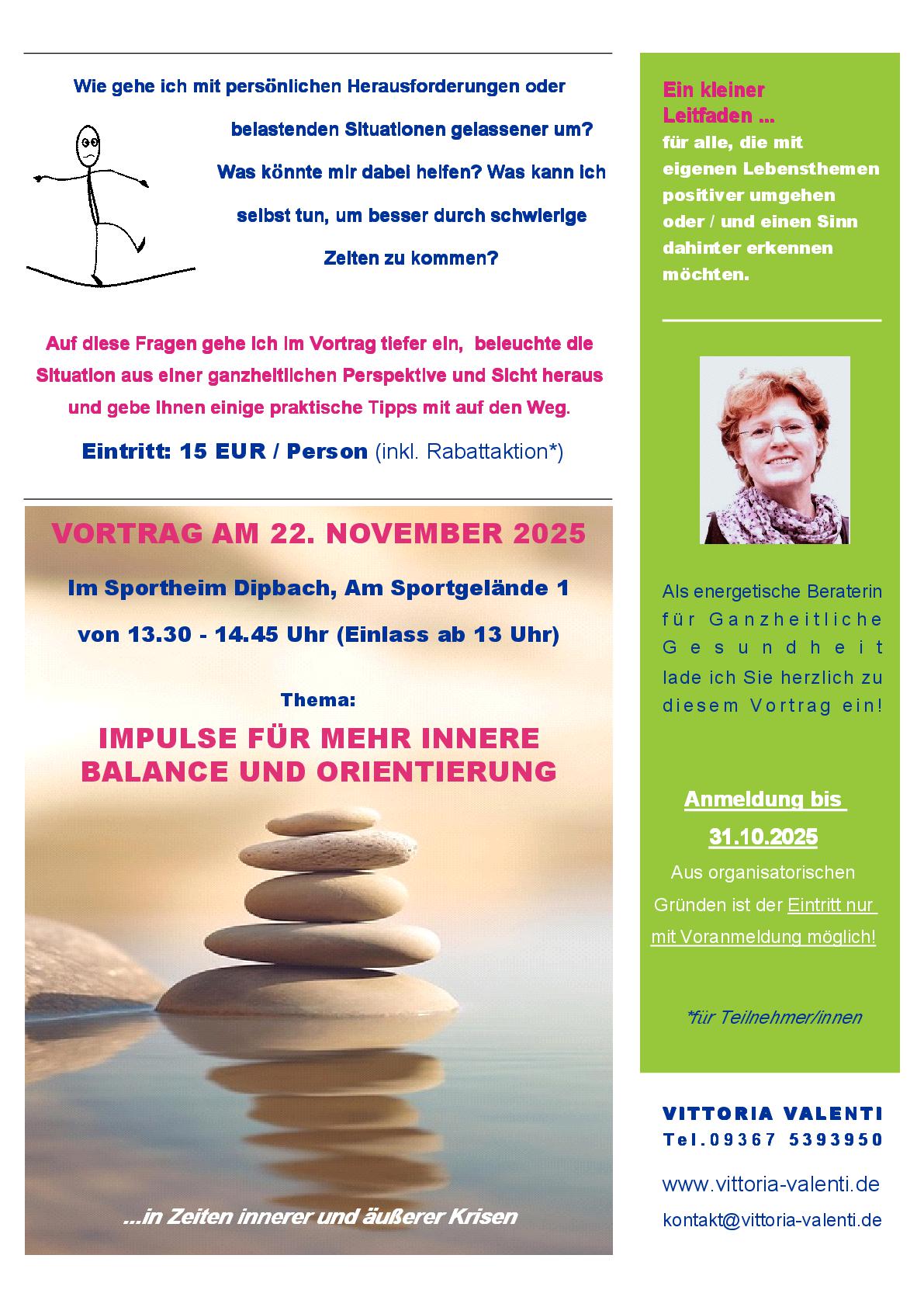 Darauf gehe ich in diesem Vortrag ein, beleuchte die Situation aus meiner Lebenserfahrung und der ganzheitlichen Sicht heraus, und gebe ganz praktische Umsetzungs-Tipps. Der Vortrag soll als kleiner Leitfaden gedacht sein, wie jede/r Einzelne positiver mit eigenen Lebensthemen umgehen kann und evtl. sogar einen tieferen Sinn darin erkennen kann.